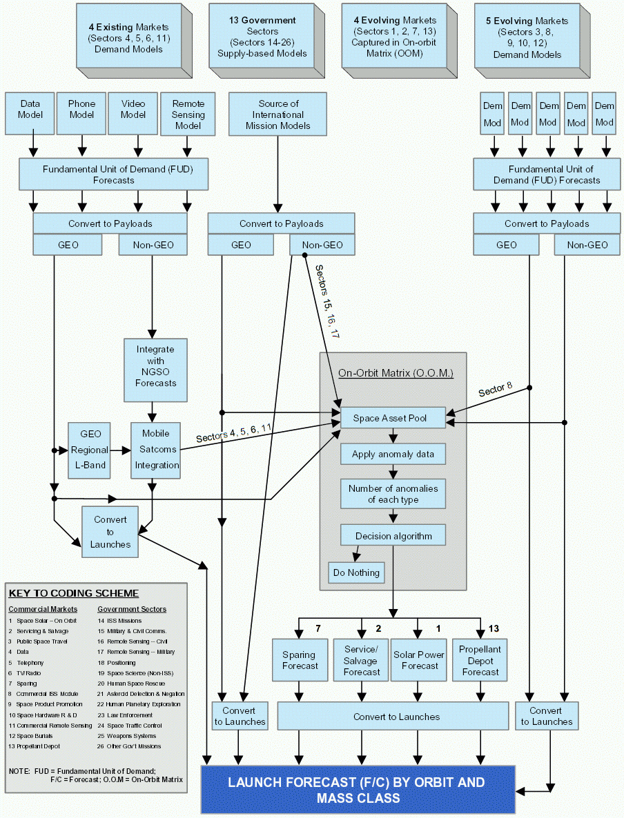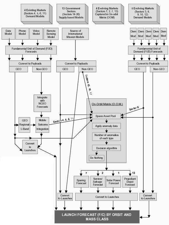 Figure E 1 shows an overview of the demand model process used in the ASCENT Study, including an insight into the 26 separate market sectors that were individually evaluated. The figure also introduces a common data model, known as the On-Orbit Matrix (OOM), which uses historical data to project life cycles and anomalies of existing and forecasted on-orbit assets. The OOM ensures that there is no double-counting of market opportunities between the Evolving Markets geared towards on-orbit asset management that all depend upon the same on-orbit infrastructure.