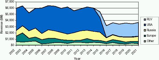However, as a demonstration of the Model's capability, Figure E 8 is included to show the kind of results that the model can deliver for the Base Case forecast and current and soon-to-be-introduced launchers. While there are peaks and valleys among the various space-faring nations, there are no major trends, although there is a gradual erosion of US market share by Russian vehicles (most likely due to their relatively high reliability and lower price).