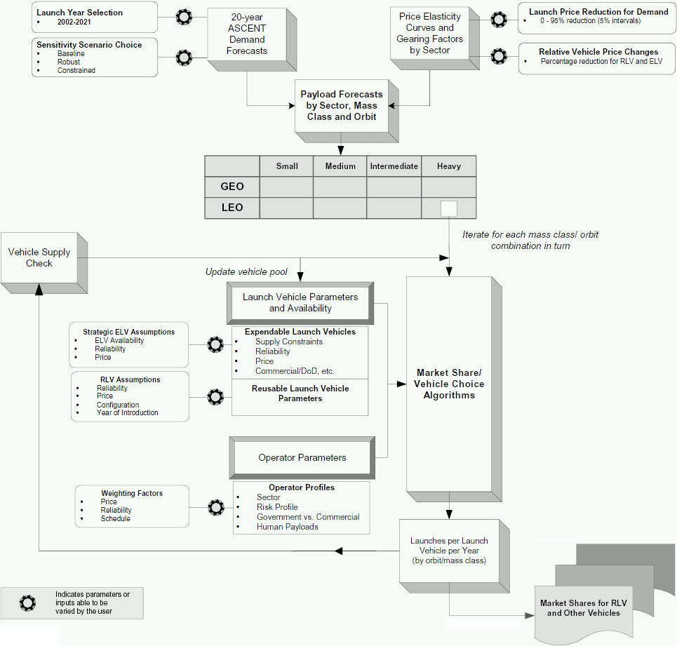 In the real world, operators buy a given launch vehicle for a great many interrelated reasons and not all of them can be included in a model. Nevertheless, procurement processes tend to follow a certain inevitable logic, and the vehicle choice algorithms at the heart of the ASCENT Market Share Model have been developed as a result of a thorough study of real world procurements (seen from the perspective both of the launch vehicle manufacturer and of the purchasing operator). The weighting of the different factors in the decision process varies from sector to sector depending on the kind of buyer (e.g., whether entrepreneurial or risk-averse), which enables a higher level of fidelity in the market share calculations.