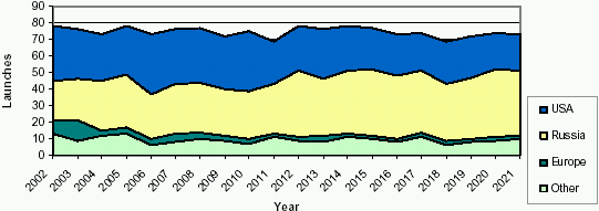 The forecast also indicates a gradual switch from medium to intermediate class launches and a steady increase of commercial market share from a quarter to half of launches, and the continued erosion of U.S. market share of all launches from the 40% down to the 25% level.