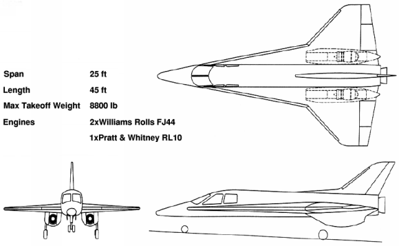 Ascender has a cabin equipped for a crew of two and a payload bay. The payload can either be experiments or two passengers. The engines provisionally selected are two Williams-Rolls FJ44 turbofans and one Pratt & Whitney RL10 rocket.