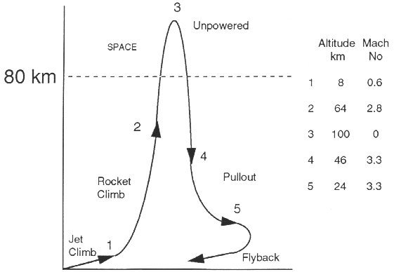 A typical trajectory is shown in fig. 3. Ascender takes off from a conventional runway and climbs on jet power at subsonic speed to an altitude of 8 km. The rocket motor is then started and the pilot pulls up into a near vertical climb. When the rocket fuel is used up, Ascender is climbing close to the vertical at a height of 64 km and a speed of Mach 2.8. It then coasts on an unpowered ballistic trajectory (i.e. zoom climb) to a maximum height of 100 km and then enters a steep dive. On reaching the effective atmosphere the pilot pulls out of the dive and flies back to the airfield from which he took off some 30 minutes previously. It would offer about two minutes of microgravity, and would fly high enough for superb views of the Earth and for the sky to turn black with bright stars even in daytime.
