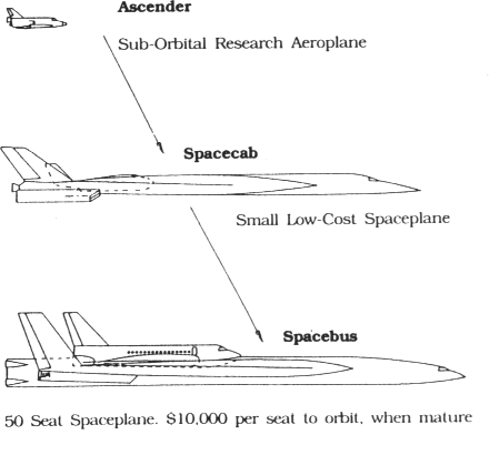 Spacecab would be followed by the 50 seat Spacebus, which when mature has a direct operating cost per person to orbit of some $5000 [2].
