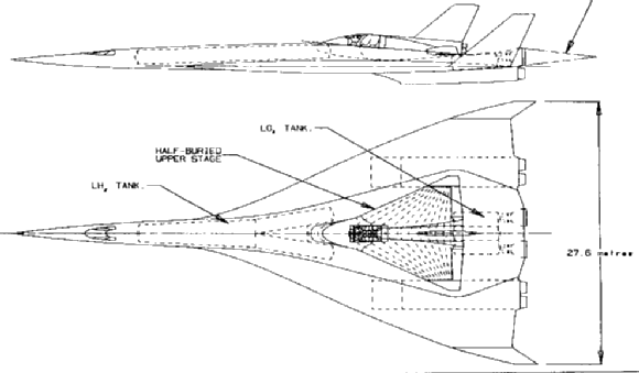 The carrier aeroplane lower stage looks not unlike Concorde, but has a simpler aerodynamic shape and structure. This is acceptable because Spacecab has only to accelerate to maximum speed, release the upper stage, and fly back. There is no long range cruise requirement, and hence no need for the last percentage point of aerodynamic or structural efficiency.