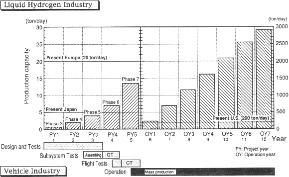 Although length of each phase is not specified for the liquid hydrogen scenario, a constant step-up of production capacity will be desirable. On the other hand, there will be another requirement for time schedule of vehicle development which determine the demand of liquid hydrogen. It is the most desirable that the demand increases keeping a good balance with the growing hydrogen supply shown by the scenario. Figure 2 is a diagram to show liquid hydrogen supply in a scale of net loading capacity of liquid hydrogen vs. vehicle development time schedule. The liquid hydrogen supply shown by the bars is based on a hypothetical time schedule of a vehicle development prepared to show an example of relation between increases of demand and supply of liquid hydrogen. In this case, the increase rate is logarithmically uniform. In an actual case, however it will depend on largely on the certification flight requirements that is to be determined.