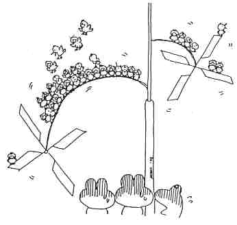The little frogs' windmill project was so small that the Institute wasn't really interested, but being close neighbours, the big frogs often visited the little frogs. As the little engineer-frogs progressed they received a continual stream of criticism and advice from the big frogs. For example they would say "Why are you making the windmill blades out of bark? They will be very inefficient."