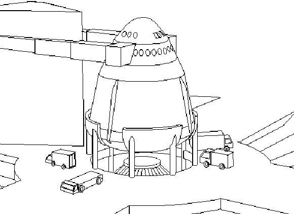 1. Departure of Kankoh-Maru from the hotel at a time calculated to enable it to land at a selected airport when the orbit plane next passes through it. Having made a partial fly-around of the hotel, Kankoh-maru drifts below the hotel where the pilot uses thrusters to move further down away from the hotel.