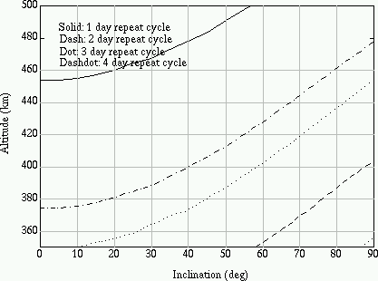 The solution is that the hotel and landing-site return to the same alignment when 23.6 hours or a multiple of it is equal to an integral number of hotel orbit periods. As already noted, the period of an orbit depends on its altitude; consequently, if we are to achieve the desired "resonance" between the planar and phasing landing-windows (ie whole numbers of each coincide periodically), only certain precise orbital altitudes will be acceptable for the hotel. The orbital altitudes that permit landing-windows repeating at intervals of one, two, three or four days are shown in Figure 2. (It is interesting to note that the Salyut and Mir space stations made extensive use of two-day and three-day repeat-cycle orbit altitudes, in order to provide conveniently frequent launch opportunities for Soyuz and Progress rendezvous missions [10].)